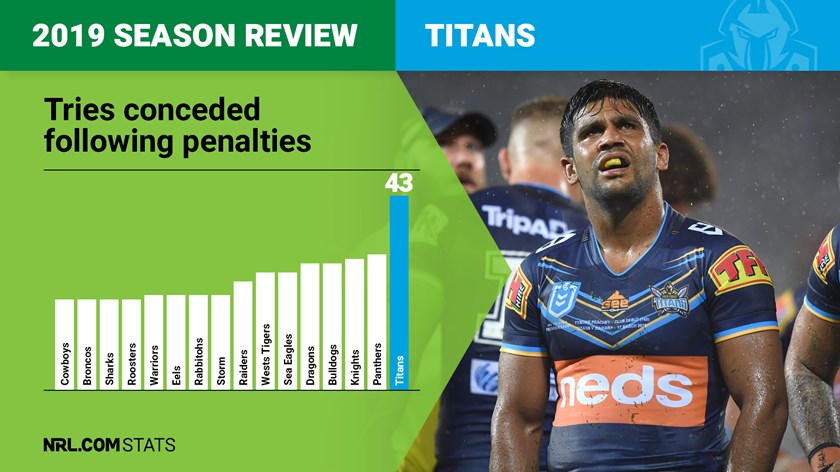 Penrith were the most-penalised team in the comp with 189 infringements while the Titans were mid-table at 161 penalties, meaning their strike rate of defending penalties was significantly worse than any other team.
