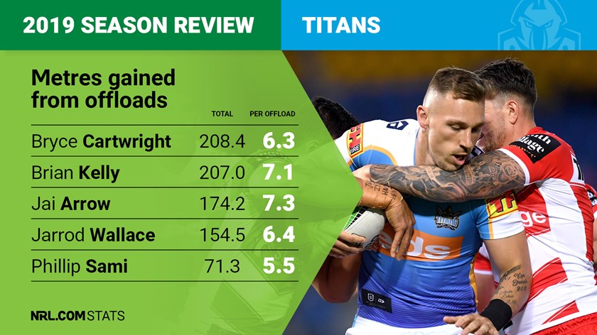 The Titans made the 13th most metres from offloading but were worst in the NRL on a per offload basis, gaining an average of just 5.9 metres per offload thrown. Bryce Cartwright and Brian Kelly led the way, each contributing just over 200 metres for the season of ground gained at 6.3 and 7.1 metres per offload respectively.