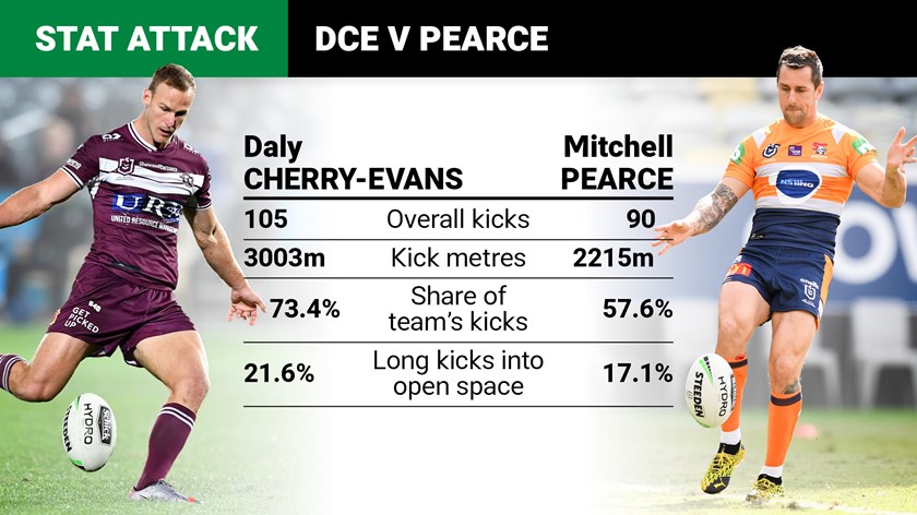 Similarly to Cherry-Evans, Pearce's halves partner Kurt Mann - who has been in great touch - isn't a traditional five-eighth and doesn't do much long kicking. He is ranked 35th for overall kicks with 23.