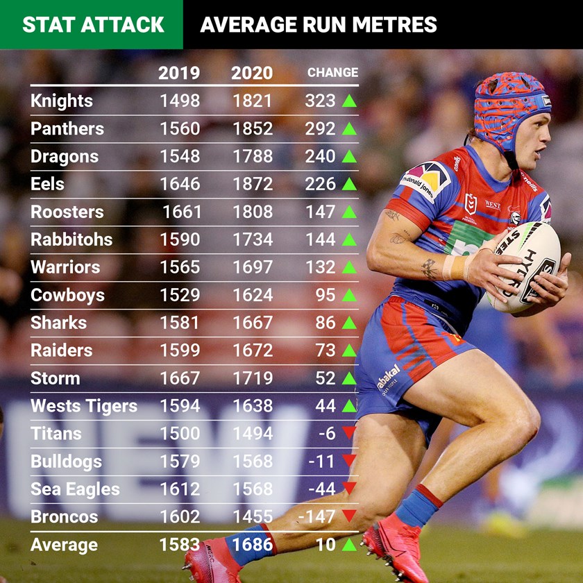 It's no coincidence that Newcastle's worst performance of the year in last week's 36-6 loss to the Warriors also featured easily their worst effort in run metres of 2020; their 1246 metres gained fell 400 metres short of their second-worst, the 1645 they made in round one, also against the Warriors.