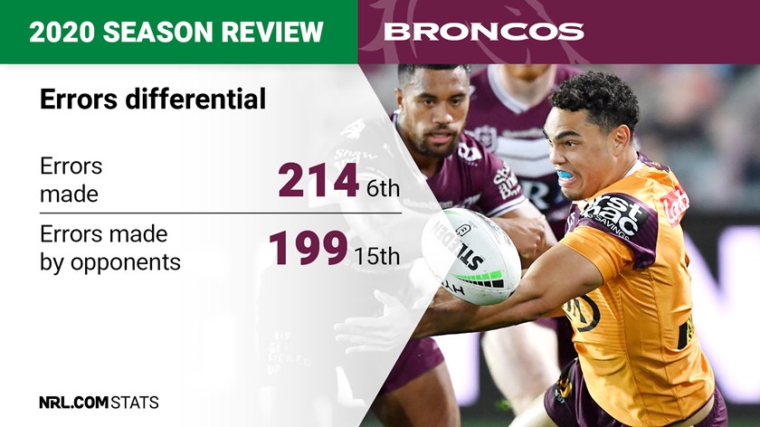 Despite ranking sixth in the league when it came to handling errors the Broncos still had a negative "errors differential", with their opponents making just 199 errors compared to their own 214.