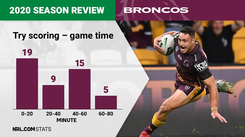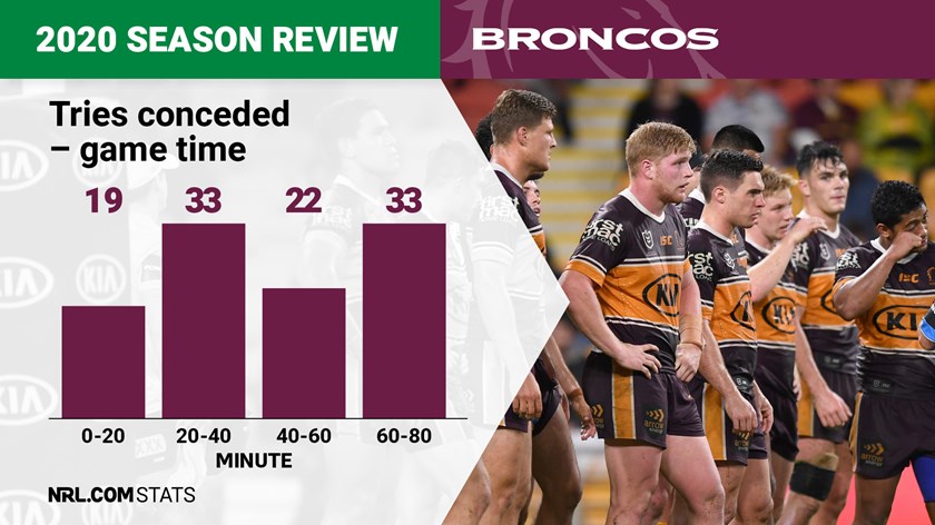 These aren't good numbers for Brisbane across the board but especially in the final 20 minutes of each half, with a combined 66 tries conceded.