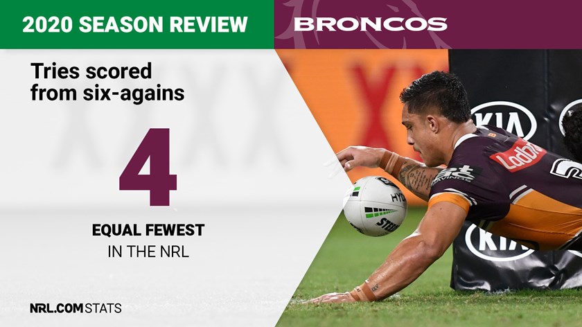 For a team that struggled in attack generally it's no surprise to see the Broncos rated poorly – equal worst in the league – when it came to scoring tries after receiving a six-again from a ruck infringement.