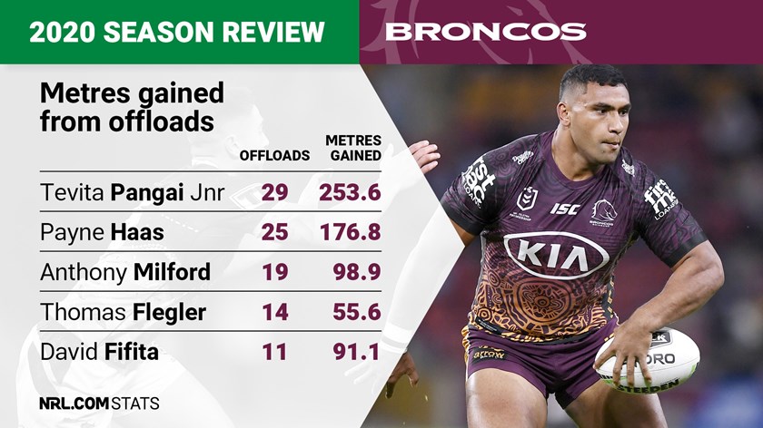 No Broncos ranked inside the league's top 15 for offloads thrown but Tevita Pangai jnr was the closest, earning more than 250 metres in extra metres gained from his offloads this season.
