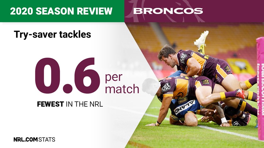 Of course missed tackles isn't the only barometer of a team's defence, and one clue to the Broncos' frailty when it came to defending their own goal-line was a lack of try-saving tackles.