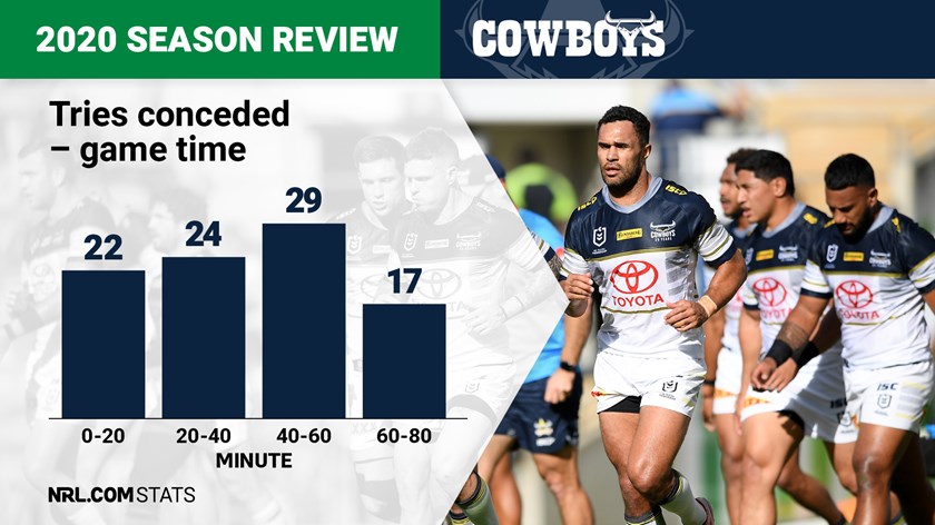 It wasn't just in attack that the Cowboys started slowly. They conceded a whopping 37 tries - 40.2 percent of a total of 92 - in the opening 30 minutes of their games. The team also struggled to come out firing in defence immediately after the break, leaking another 17 tries (18.5 percent) between the 40th and 50th minutes.