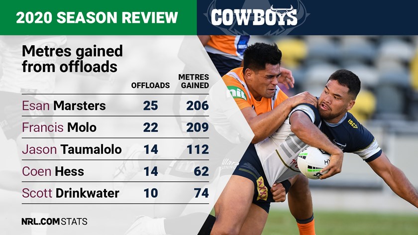 Esan Marsters had a mixed first season as a Cowboy, but one thing that can't be denied is the centre's offload production. The Kiwi threw a team-high 25 offloads - and he only played 12 games.