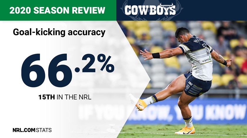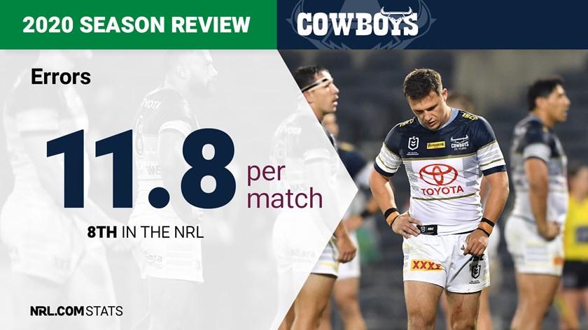 The Cowboys ranked eighth for errors. They averaged 11.75 per match with 235 overall. Playmaker Scott Drinkwater produced the most mistakes with 32, followed by Holmes (20), Feldt (19), Marsters (14) and Tabuai-Fidow (14).