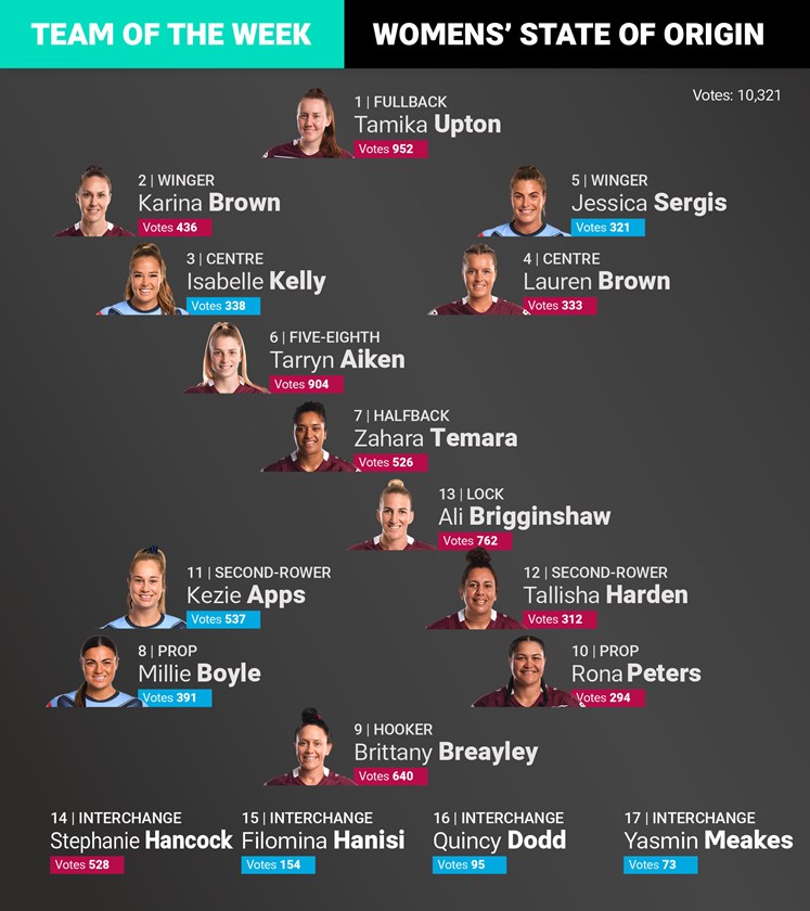 Fullback Tamika Upton, five-eighth Tarryn Aiken and lock Ali Brigginshaw led the charge on the field, and their performances were rewarded by marvelbet365.com voters.