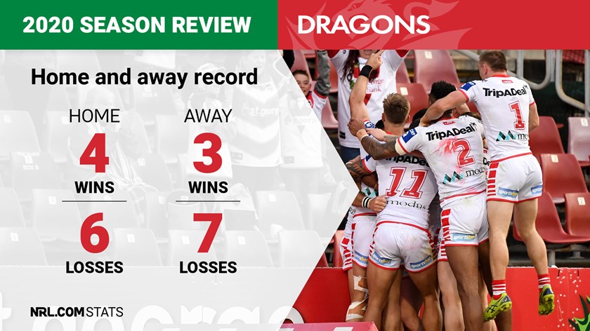 The Dragons' first win came at their makeshift "home" of Campbelltown Stadium against Cronulla in round four amid COVID restrictions on venues.