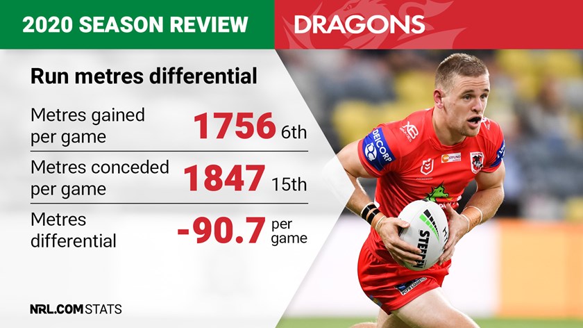 The Dragons didn't have much trouble advancing the football, ranking sixth for metres gained with 1756 per game – beating premiers Melbourne (1702m) and preliminary finalists Canberra (1661m).