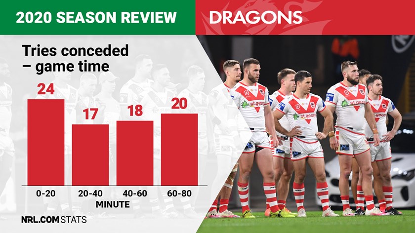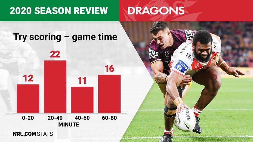 The Dragons were relatively slow starters, conceding 24 tries (30.4 percent) inside the opening 20 minutes (they scored 12 in that period) while leaking another 11 (13.9 percent) from the 21st to 30th minute.