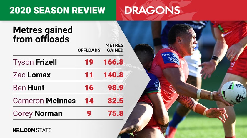 Centre Zac Lomax only threw 11 offloads but they were very effective, leading to 140.8m gained. Ben Hunt (16 offloads, 98.9m), Cameron McInnes (14 offloads, 82.5m) and five-eighth Corey Norman (9 offloads, 75.8m) also had decent contributions in this department.