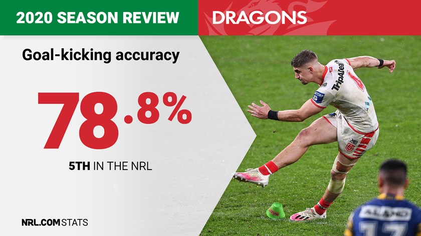 The Dragons had the fifth-highest success rate, just a shade behind Penrith (79 percent). The Rabbitohs, with top point-scorer Adam Reynolds as their kicker, had the best rate of 84.6 percent.
