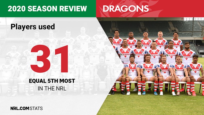 The Dragons were among a swathe of teams to use 31 players in 2020, one behind the top total of 32 shared by the Broncos, Raiders, Storm and Warriors.