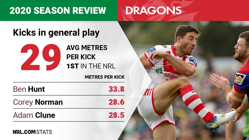 St George Illawarra averaged more metres per kick (29) than any other team. The NRL average was 26.8m.