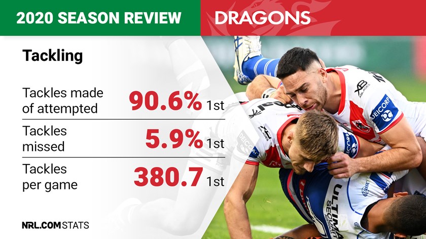 Belying their ladder position, the Dragons achieved the highest percentage of tackles from those attempted per game (90.6 percent). They missed only 5.9 percent of their tackles (1st in league).