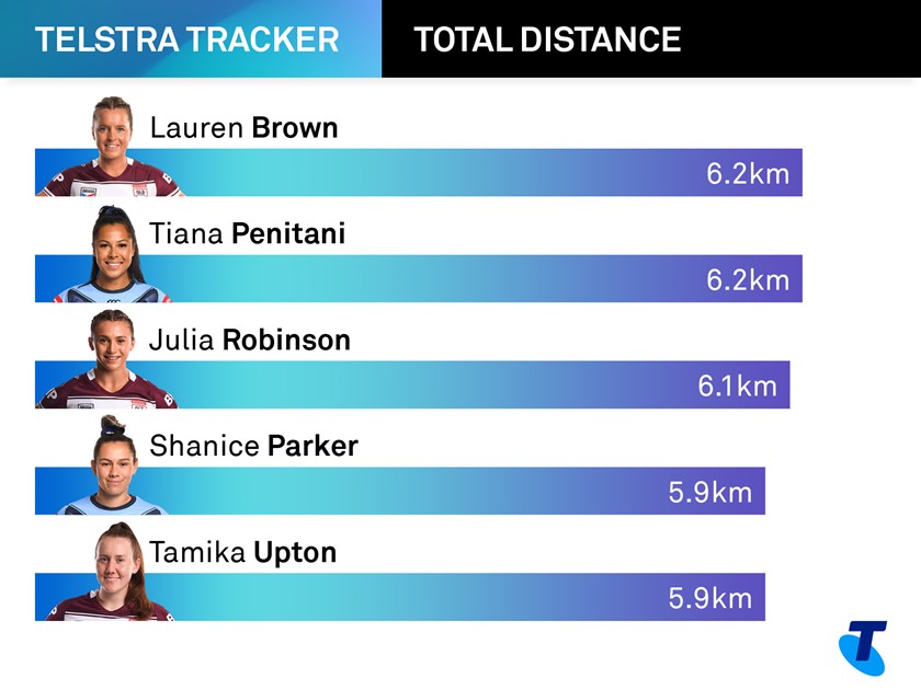 Opposing centres Lauren Brown and Tiana Penitani led the way with 6.2 kilometres apiece, while Julia Robinson came in a close third with 6.1 kilometres.