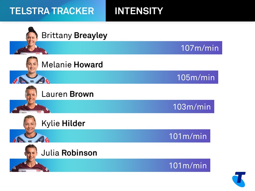 Returning Maroons hooker Brittany Breayley topped the metres per minute statistic with 107 every 60 seconds.