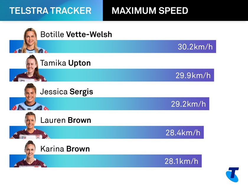 Well-contained by the Maroons out wide, Sergis reached a maximum speed of 29.2km/h in the loss - 0.2 short of her game-high efforts last year - but was eclipsed in efforts from Upton (29.9km/h) and Botille Vette-Welsh (30.2km/h) overall.