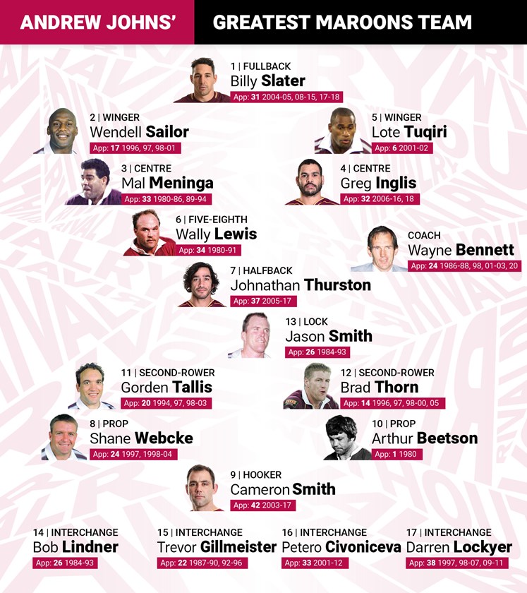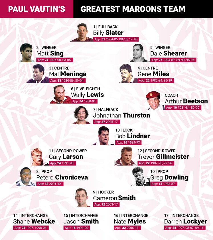 The late Beetson, who led the Maroons in the first Origin match, was a popular choice at prop. Shane Webcke beat Petero Civoniceva and Matt Scott for the privilege of starting alongside big Artie, with Petero making the bench and Scott unluckily missing out altogether.
