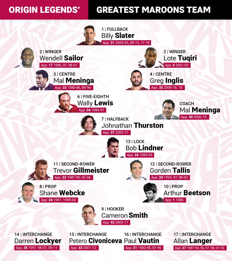 On the wings, Broncos legends Wendell Sailor and Lote Tuqiri gained starts ahead of Darius Boyd and Kerry Boustead. Tuqiri played three of his six Origins, in which he scored five tries, with Sailor in 2001.