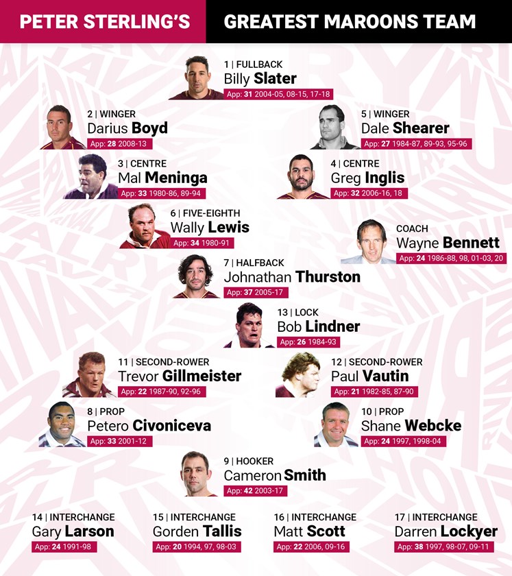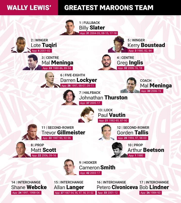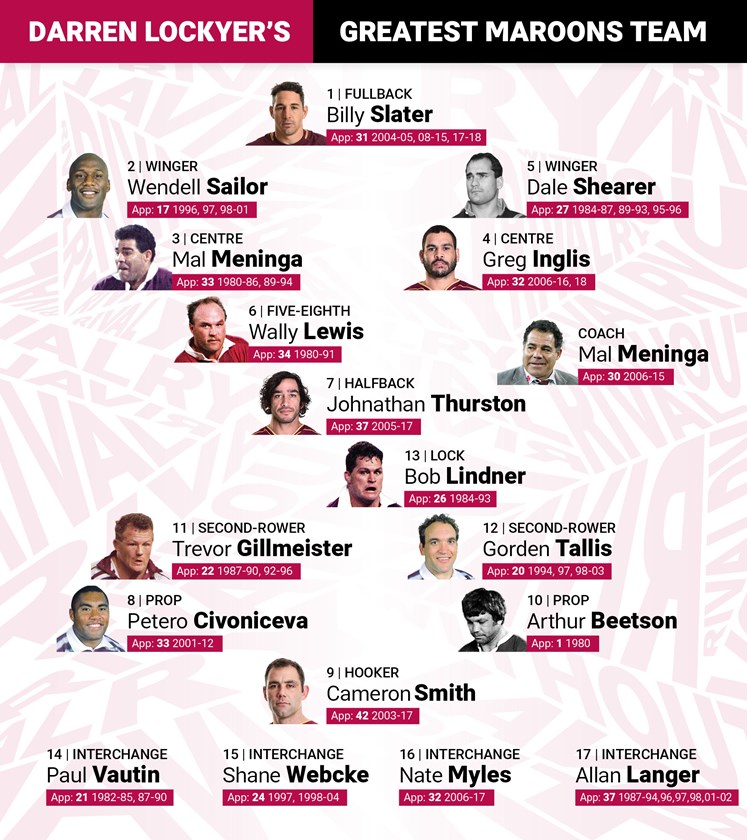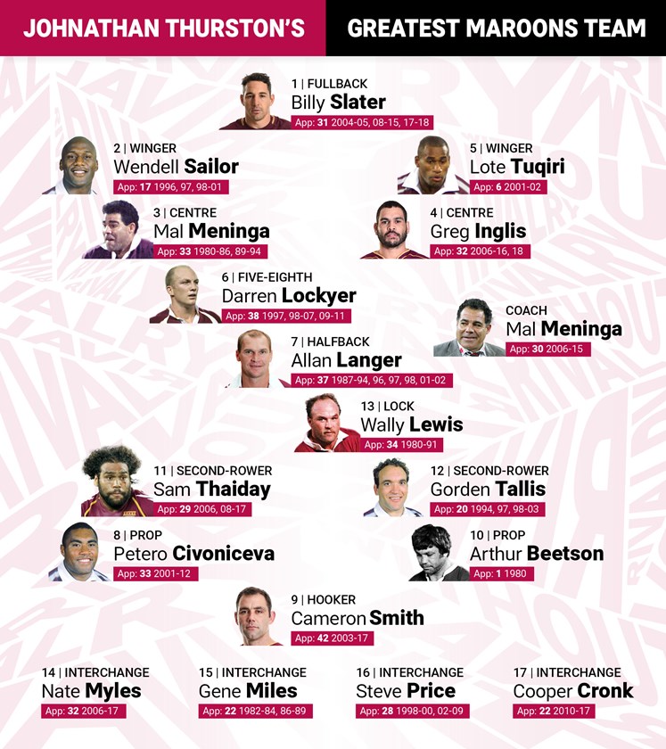 Slater (fullback), Lewis (five-eighth), Thurston (halfback) and Lockyer (bench) were unanimous Maroons selections by their fellow judges - albeit in a few different positions - despite not voting for themselves.