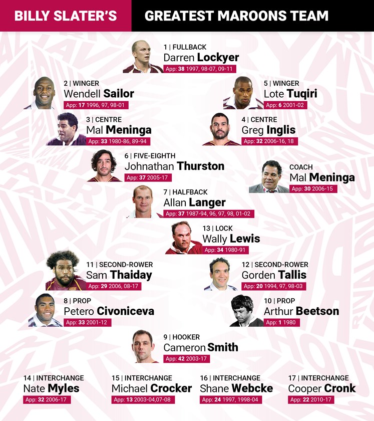 Picking Darren Lockyer at fullback at his own expense allowed Slater to go with Johnathan Thurston and Allan Langer as his halves with Wally Lewis at lock. Slater recognised Michael Crocker with a bench spot.