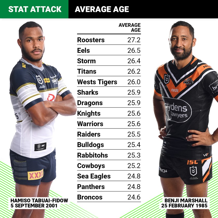 The three "oldest" sides – the Roosters, Parramatta (26.5) and premiers Melbourne (26.4) – all finished in the top four.