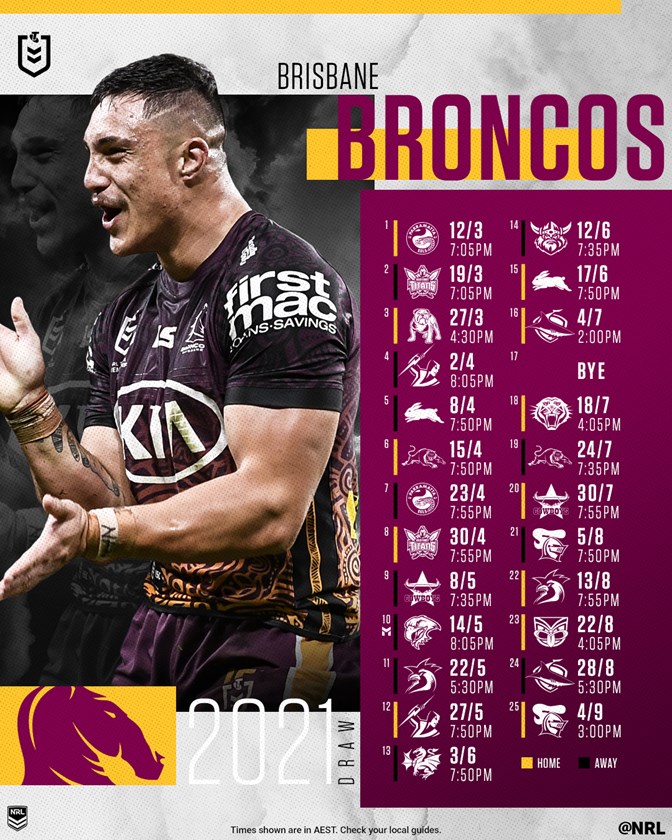 Here is all you need to know about the Brisbane Broncos' 2021 Telstra Premiership draw.