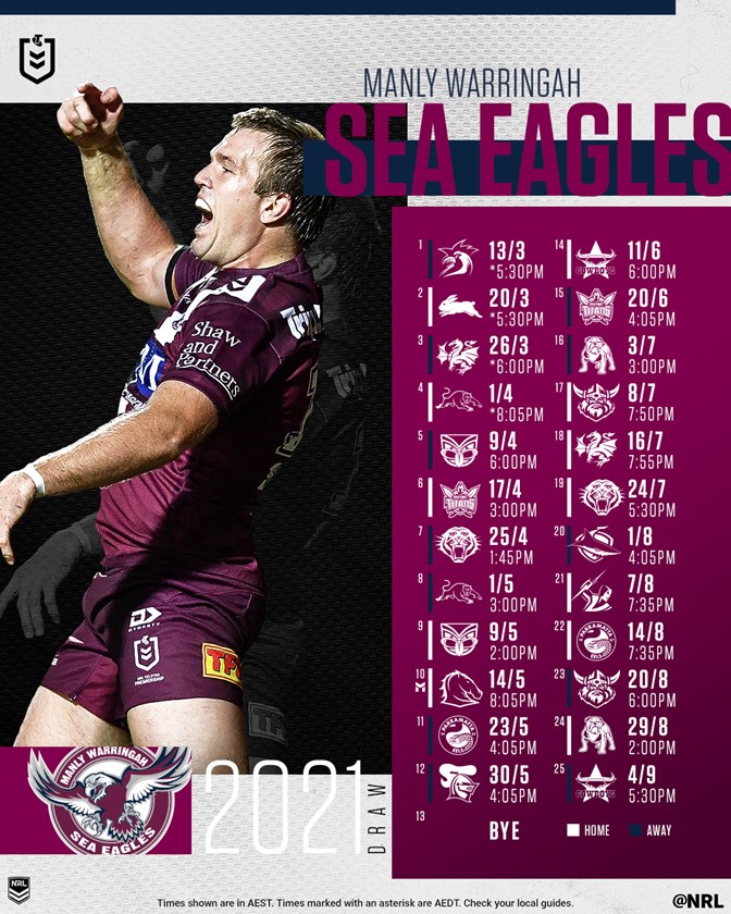 Here is all you need to know about the Manly-Warringah Sea Eagles' 2021 Telstra Premiership draw.