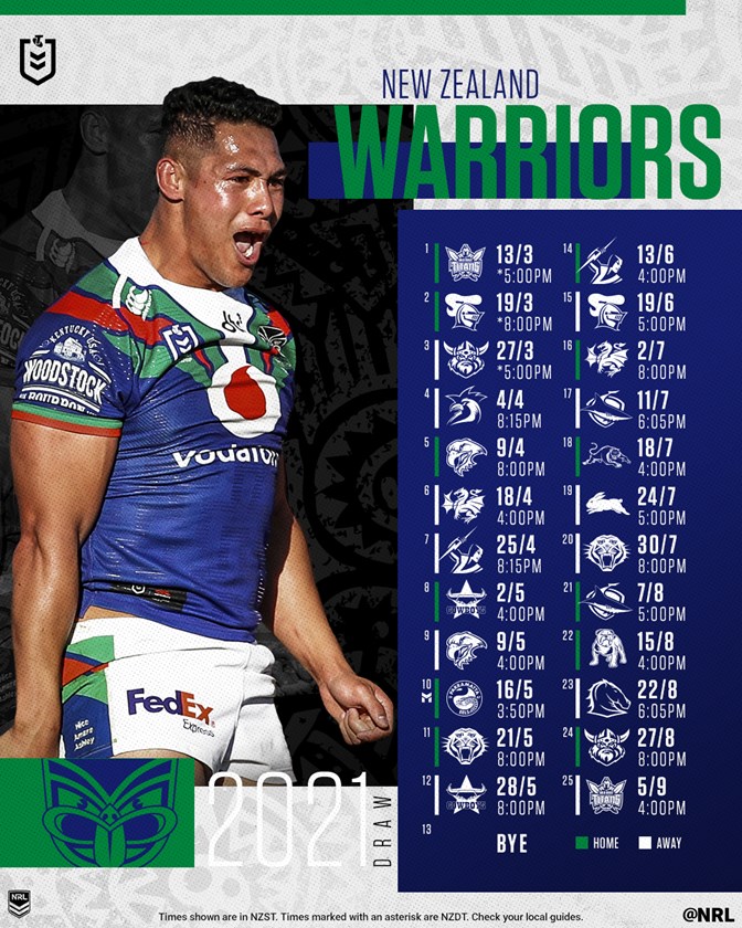 The Warriors will start their campaign against the Titans at Mt Smart Stadium, where they've won nine of 12 clashes at home between the two sides, followed by another home game hosting the Knights six days later. The Raiders and Roosters (both away) complete a tough first month.