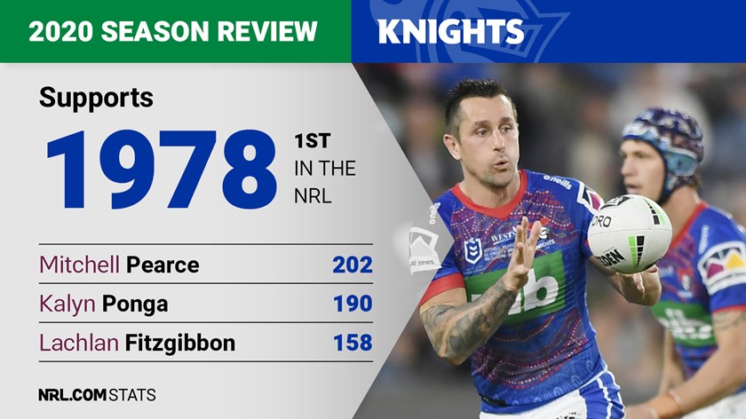 Mitchell Pearce (202) and Kalyn Ponga (190) were among the Knights' best at sniffing around the ball with Lachlan Fitzgibbon (158) and Aidan Guerra (153) prolific on the edges at making themselves available to be part of a play.