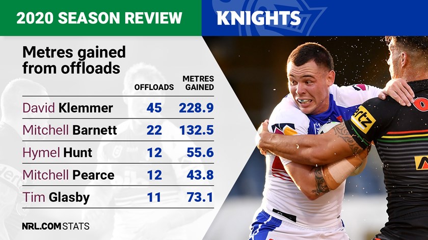 The Knights sat mid-table throughout the year for offloads with a total of 172 but struggled to build any momentum from their attempts to build second-phase with a 5.5 metres gained average per attempt.