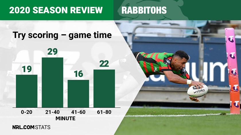 In the home and away rounds, South Sydney scored the bulk of their tries (29) between the 21st minute to half-time (33.7 percent).