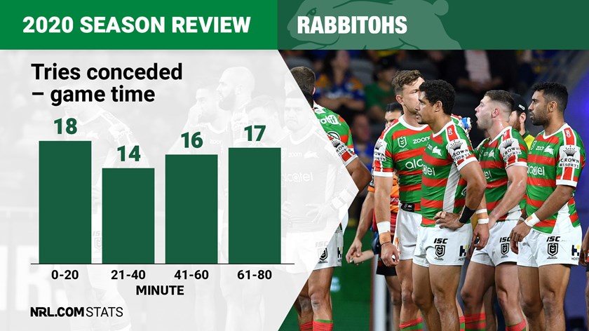 Defensively the Rabbitohs were sound, only conceding 65 tries (seventh in league) across the regular season. The opening 20 minutes of matches was their most vulnerable, with 18 tries (27.6 percent) falling in that period. They conceded 17 tries in the last quarter but tightened the screws either side of half-time.