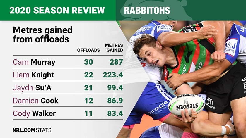 Back-rower Cameron Murray was the team's offload specialist, moving the ball on 30 times across the season - to help the Rabbitohs gain 287 metres.