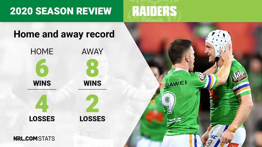 Canberra's overall 14-6 record was good enough for a fifth-place finish and nothing to sneeze at but their away record was phenomenal. Their home record looks middling by comparison but it's important to note that two of those four losses came in "home" games at Campbelltown Stadium when the competition first resumed under strict COVID protocols and the Raiders had to travel to and from Sydney by bus on game day.