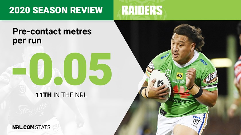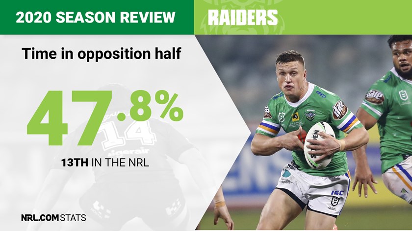 In an even more alarming statistic for Stuart's men over the off-season, only three teams spent more time in their own half than Canberra in 2020 – Brisbane, Manly and Gold Coast. Again several things feed into this – scoring tries, earning repeat sets, efficient last-play options and winning the midfield arm-wrestle. The Raiders will want to spend more time in good-ball next year.