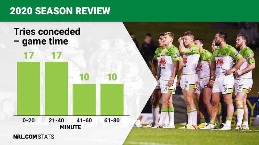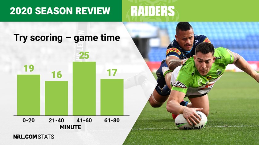 The Raiders scored roughly a third (32.5 per cent) of their 77 season tries in the 20 minutes after half time and were steady in the other three quarters. Their first and last 10 minutes of games were quiet, with six and seven tries respectively in those brackets.
