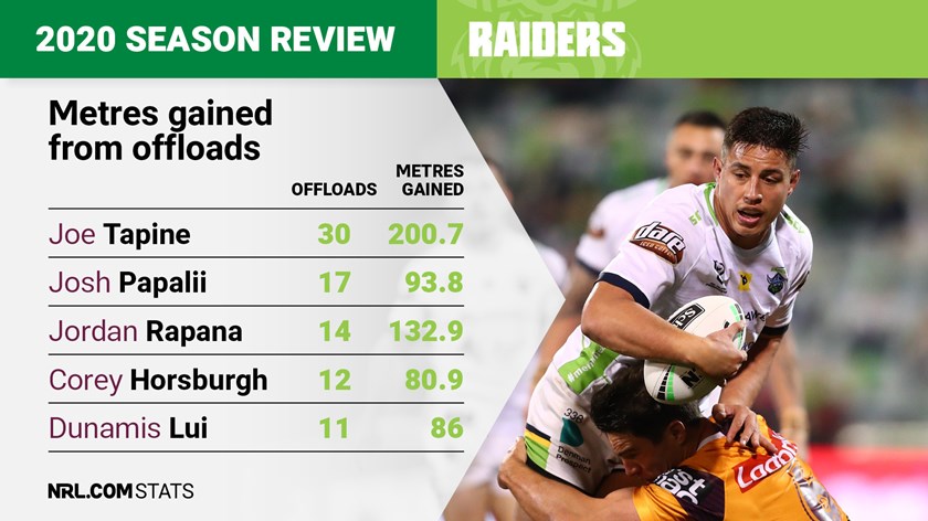Offloads weren't a big part of the Raiders' attack in 2020, although dynamic lock Tapine was more than happy to slip a few away to comfortably lead his side in that department with 30 thrown for the season (fifth in NRL). Next best was Josh Papalii whose 17 was 41st-most in the NRL.