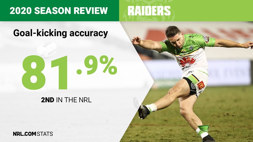 Ever-reliable captain Jarrod Croker had his laser sights calibrated in 2020, helping the Green Machine to second-best in the NRL when it came to turning four points into six. Unsurprisingly there were no Raiders losses in 2020 that came down to goal-kicking.