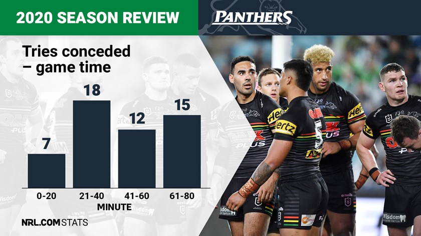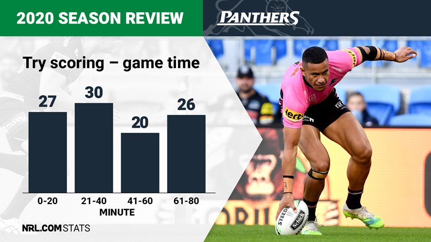 A quiet start to second halves of games, scoring just seven tries between half-time and the 50-minute mark, is the only blemish on an otherwise consistent try-scoring record for the Panthers. With the bulk of their tries coming in the first half Penrith were in a dominant position early in most matches and almost always rode that advantage home to victory.