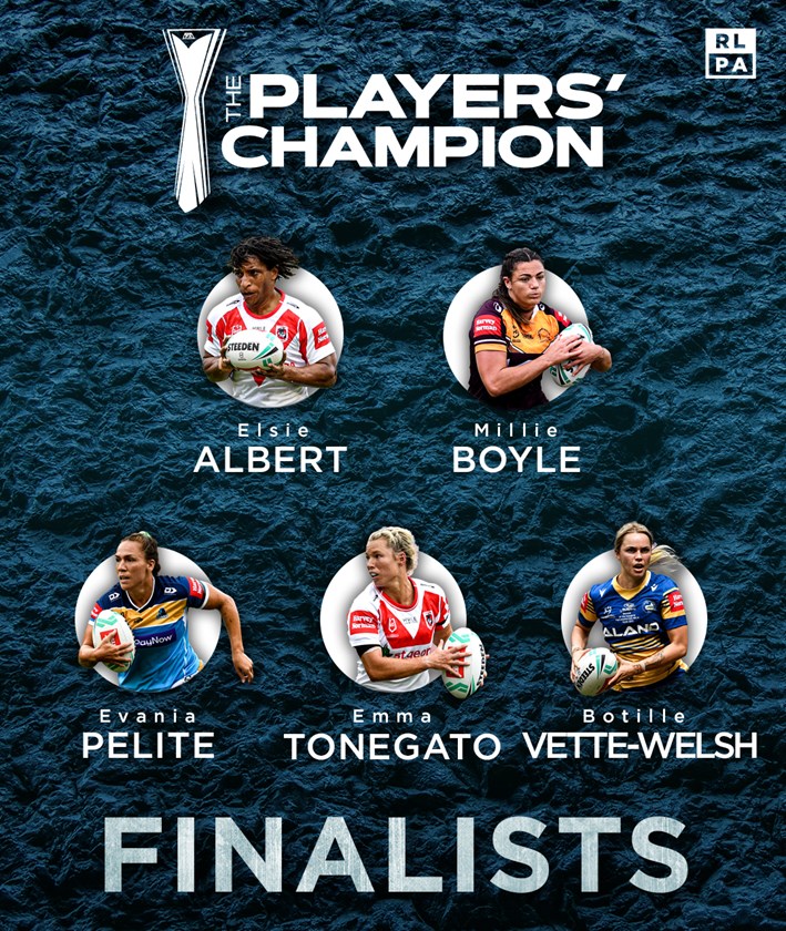 Elsie Albert (Dragons), Millie Boyle (Broncos), Evania Pelite (Titans), Emma Tonegato (Dragons), and Botille Vette-Welsh (Eels) are in contention for the honour after finishing in the top five voted players for the 2021 NRLW season.