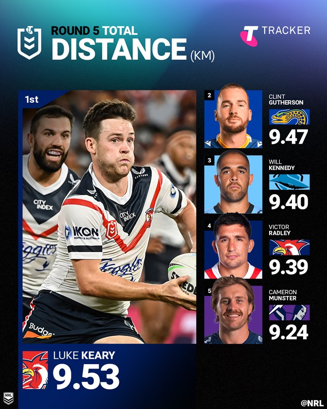 Keary's 9532 metres run were more than any other player, edging out Eels fullback Clint Gutherson (9477m) and Sharks fullback Will Kennedy (9408m), while Roosters teammate Victor Radley was narrowly behind the trio with 9396 metres.
