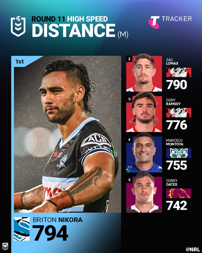 Nikora's 794 metres was more than any other player, with Dragons backs Zac Lomax (790m) and Cody Ramsey (776m) rounding out the top three.