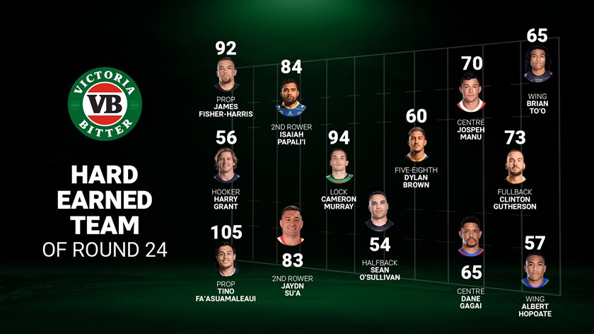 Rabbitohs lock Cameron Murray (94 points) and Panthers prop James Fisher-Harris (92 points) were similarly important for their respective sides as South Sydney and Penrith both secured important victories in Round 24, while Dragons duo Blake Lawrie (87 points) and Jaydn Su'a (83 points) were joined inside the top 10 by Parramatta pair Ryan Matterson (86 points) and Isaiah Papali'i (84 points).