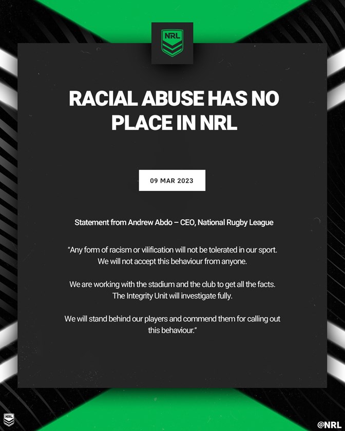 Abdo fronted the media on Friday morning and said the game would come down hard on any offenders following Thursday night's racial slur incident involving Rabbitohs star Latrell Mitchell.