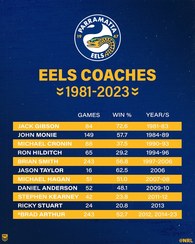 Taking charge as the Eels’ full-time head coach in 2014, Arthur was the 10th man to follow in the footsteps of the Supercoach, who took the club to three straight premierships from 1981 to ’83.