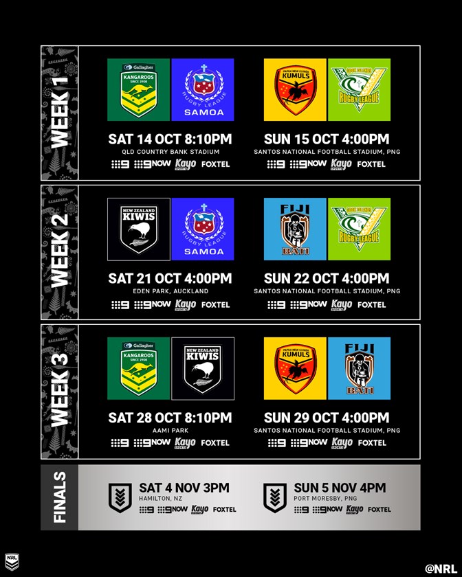 World Cup champions Australia along with New Zealand, Toa Samoa, Cook Islands, Fiji and Papua New Guinea will feature in the men's tournament – which kicks off in Townsville on Saturday – while the women's tournament features Australia alongside the Kiwi Ferns, Samoa, Fiji, Tonga, Papua New Guinea and Cook Islands.